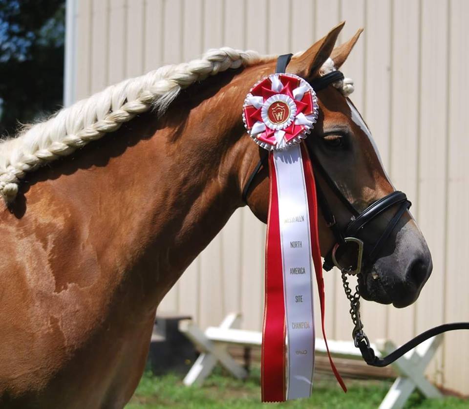 Maya's sire, the multi-champion silver classified stallion Stellar TVR , Champion Haflinger and the highest scoring Haflinger in the nation in the 2011 USDF Dressage Sport Horse Breeding All-Breeds Awards standings, and the only Haflinger stallion in history to attend the North American Performance Stallion Testing, where he received the outstanding score of 7.98: