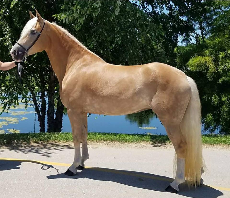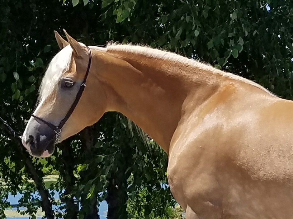 We are excited to announce that Rafinja returned home in December 2016! Raffy sold inutero, and we have been trying to purchase this spectacular filly back ever since she was born. She is currently 14.3H tall and growing (at almost exactly three years of age), possesses a stunning gold color with pure white mane and tail, and still has the exceptional movement she had as a filly that won her Gold Premium and Site Inspection Champion at her 2014 RSPI inspection!