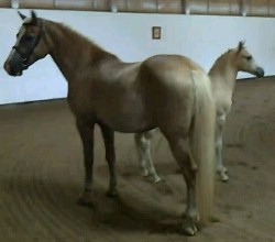 "A highlight of the day was the Haflinger mare and foal bred by Mary Procopio of New Horizons Haflingers. The RPSI inspects and registers purebred Haflingers into their own books, as a division of the pony breeding section. In Germany, the RPSI�s parent organization the Pferdezuchtverband Rheinland Pfalz-Saar registers more than 30 different breeds, including but not limited to the Warmblood books, German Riding Ponies and Kleines Deutsches Reitpferd, but also Shetland Ponies, Icelandic, Haflinger and Draft Horses each have their own books, with their own rules and regulations, and often their own brands. Ricola DTA (Adanac x Ricarda II GF � Nabucco), a nine year old Haflinger mare, showed excellent modern type with a big eye, good length of neck and balanced and substantial conformation expressing well the modern Haflinger standard. In movement, Ricola showed energy, softness and swing, with a particularly good trot and canter. This combination of type and quality of conformation, movment and substance earned Ricola the title of Champion Premium Pony Mare of the site. Site Champion Filly was Ricola�s 2014 filly Rafinja of New Horizons. Rafinja was sired by Stellar TVR, who successfully completed the North American Pony test in 2013. This substantial yet elegant filly boasted a particularly well-proportioned and balanced profile, with a clean neck tie-in and chiseled face. Long legs and excellent muscling over her topline completed the picture, while in motion, this filly also pleased the eye, with a powerful, swingy uphill trot and balanced canter." Rafinja is Stellar's first foal to be presented to RPSI. We are so proud of this special filly!