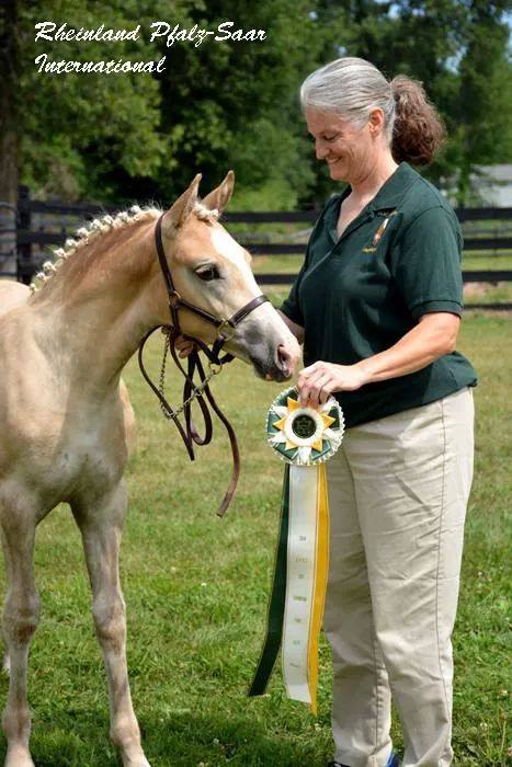 Rafinja and her dam attended the RPSI Michigan inspection on July 25, 2014 at three months of age, where she was awarded the highest status given to foals! Comments from the German inspector include: "Very well developed size, modern build with long legs--not too heavy build, well-muscled, pretty face with a very nice neck, active and stays always uphill in trot." Below is commentary taken from the RPSI site. Special thanks to Ann Daum for the fantastic photos (above) taken at the inspection!